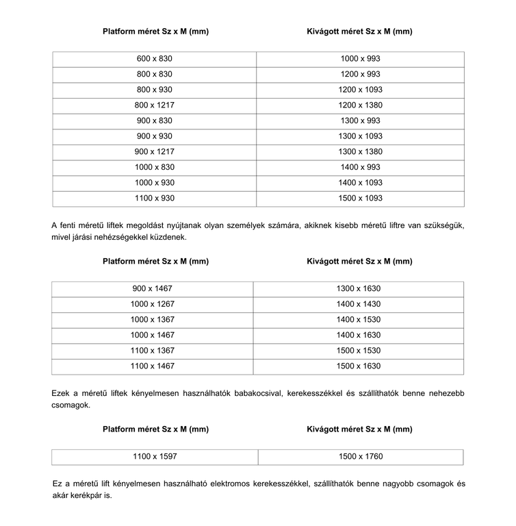 A platform mérete a kabin méretét jelenti, míg a kivágás mérete a felvonó telepítéséhez szükséges minimális méreteket jelöli (szélesség x mélység, mm).